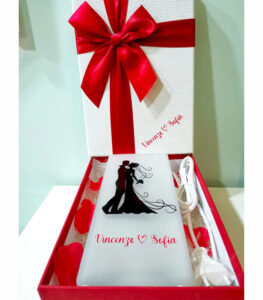 Il prodotto viene consegnato in una scatola, personalizzabile anch’essa, con petali di rose o altro a scelta.