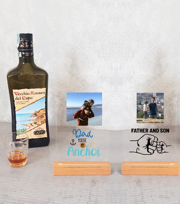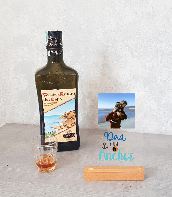 Plexiglass con basetta di legno personalizzabile con foto e frase a scelta.
