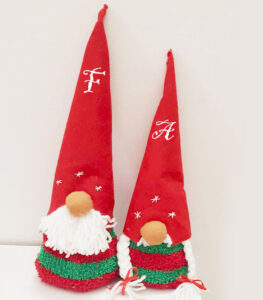 Dolci gnometti natalizi con cappellini personalizzabili. E’ possibile personalizzare i colori ed i vestiti degli gnometti, e aggiungere nomi o iniziali sul cappello.