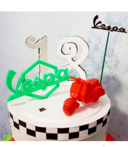 Torta scenografica 18 anni realizzata per un giovane fan della vespa. La torta è realizzata con basi di polistirolo ricoperte da gomma eva colorata. L’ultimo piano della torta è invece una dolcissima scatola, sempre rivestita di gomma eva, con una fessura utile come raccoglitore di buste regalo.